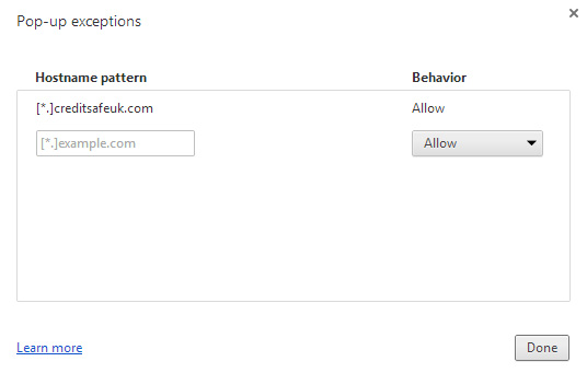 If you would like to allow the Creditsafe Pop Ups but not Pop Ups from other websites simply click the ‘Manage exceptions’ button. On the following page, you will be presented with a text field, to allow Creditsafe’s Pop Ups to operate within your browser simply type into the Hostname Pattern [*.]Creditsafe.com as shown in the image below and click ‘Done’.