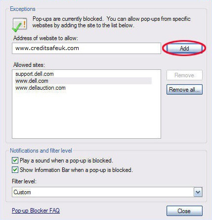 Alternatively if you would like to leave Pop Up Blockers switched on but not when using the Creditsafe website you can always allow Creditsafe Pop Ups by selecting Pop Up Blocker Options and typing in www.creditsafeuk.com and clicking ‘Add’ as shown below: