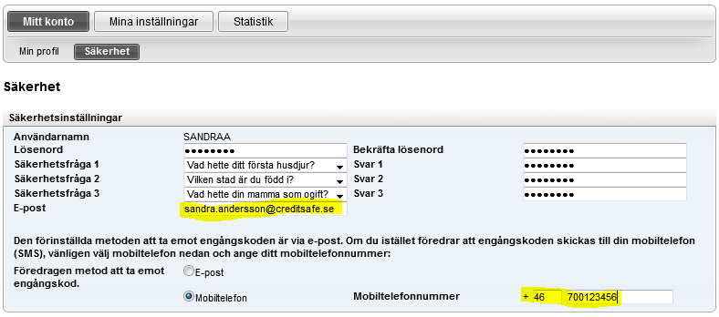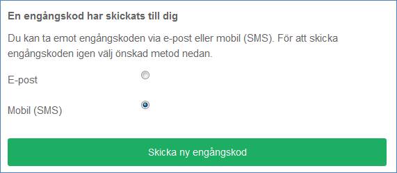 Lägg med fördel in ett mobilnummer på din användare. Om du lagt in ett mobilnummer på din användare (enligt ovan bild), kan du vid varje inloggningstillfälle välja om du vill få koden via mail eller SMS. Du kommer då att få upp båda valmöjligheterna och kan enkelt ändra metod om du exempelvis inte har tillgång till din mail eller telefon.