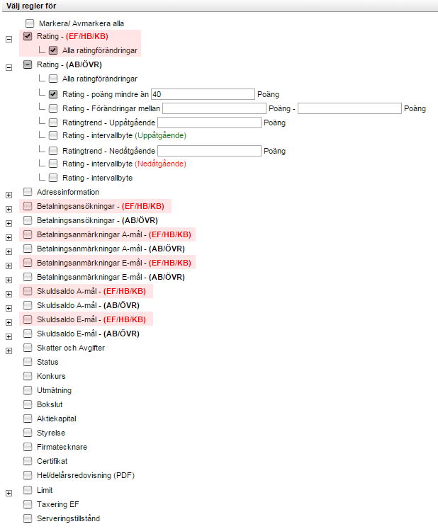 De rödmarkerade parametrarna nedan kommer att gälla för enskilda firmor (EF) samt handels- och kommanditbolag (HB/KB). Under dessa kategorier finns endast alternativet att bevaka "alla förändringar". För aktiebolag finns dock de detaljerade filterinställningar kvar, vilket gör att du fortfarande kan ha olika bolagsformer i en och samma portfölj - men med olika inställningar.